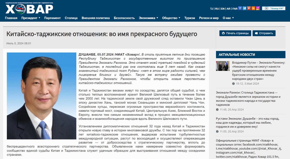 2024年7月5日,在對塔吉克斯坦進行國事訪問之際,國家主席習近平在塔吉克斯坦《人民報》和“霍瓦爾”國家通訊社發表題為《共創中塔關系美好明天》的署名文章。